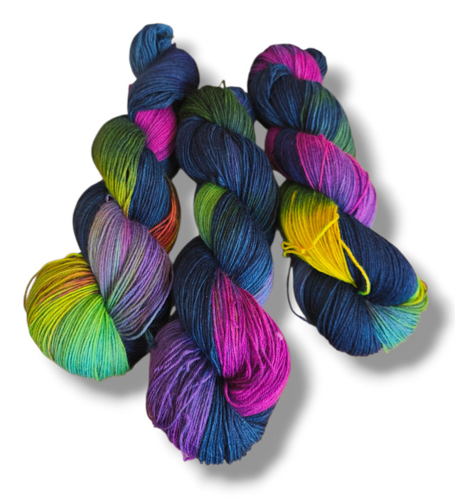 Hier haben wir eine handgefärbte Sockenwolle, die angenehm zu tragen ist und alle Eigenschaften einer guten, belastbaren Wolle mitbringt.