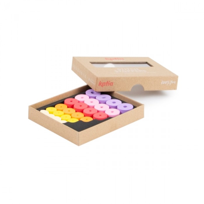 24 bunte Maschenstopper für Stricknadeln in verschiedenen Größen, sortiert in einer Schachtel aus Kraftkarton.